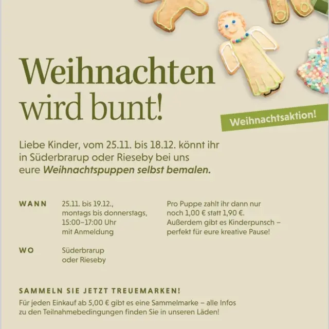 Auch in diesem Jahr könnt ihr in unseren Läden in Süderbrarup und Rieseby eure eigenen Weihnachtspuppen bemalen und leckeren Kinderpunsch genießen. Ob große oder kleine Kinder, jeder darf kommen. 😉